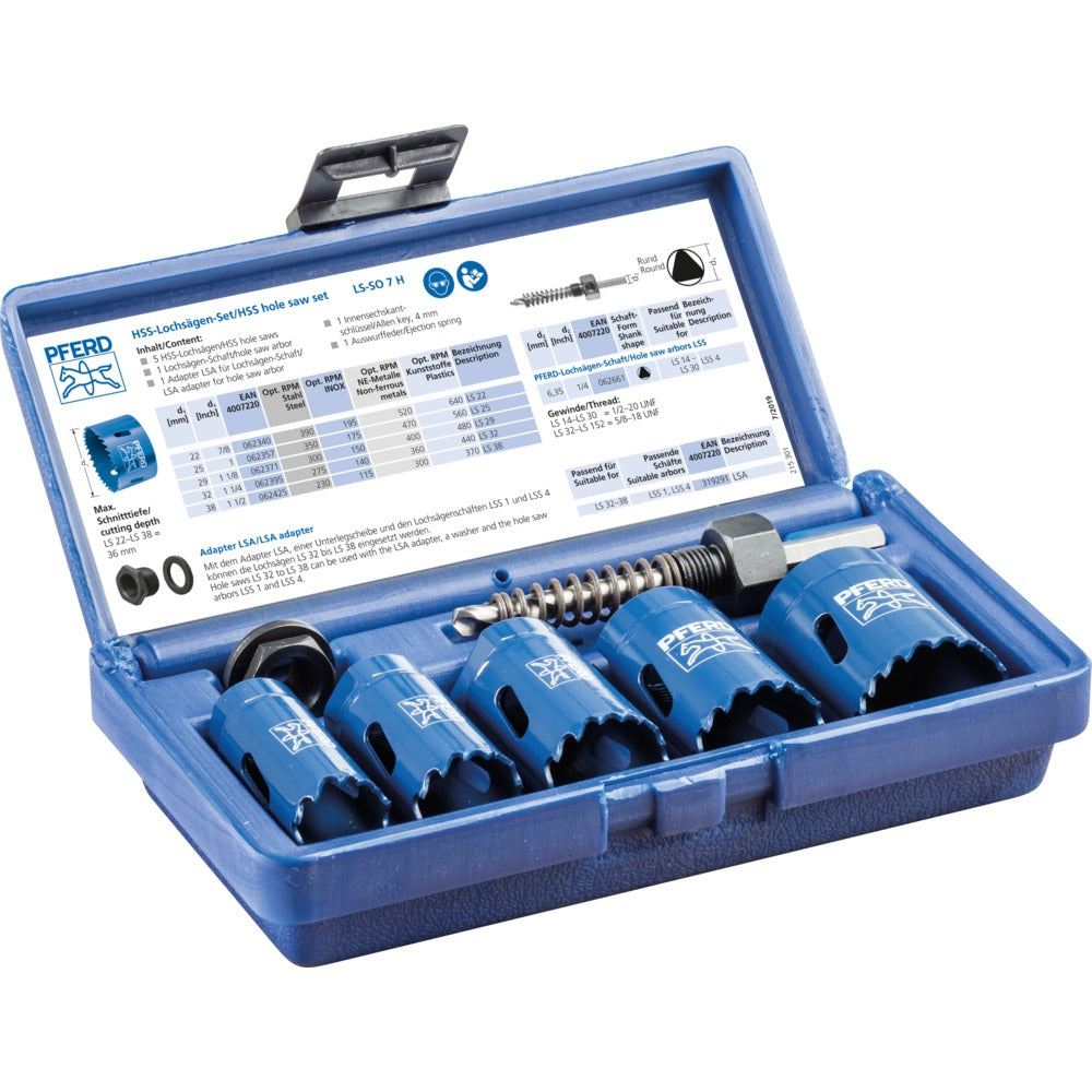 Setet innehåller fem HSS-hålsågar i de vanligaste diametrarna inklusive tillbehör. Levereras i en praktisk plastlåda som skyddar mot smuts och skador. Bruksanvisning medföljer. Hålsågar LS 32 och LS 38 kan användas tillsammans med adapter LSA och underläggsbricka. Innehåll: 5 st HSS hålsågar LS 22, LS 25, LS 29, LS 32, LS 38 1 st hålsågshållare LSS 4 1 st adapter LSA för hålsågshållare LSS 4 1 st insexnyckel, 4 mm 1 st tryckfjäder